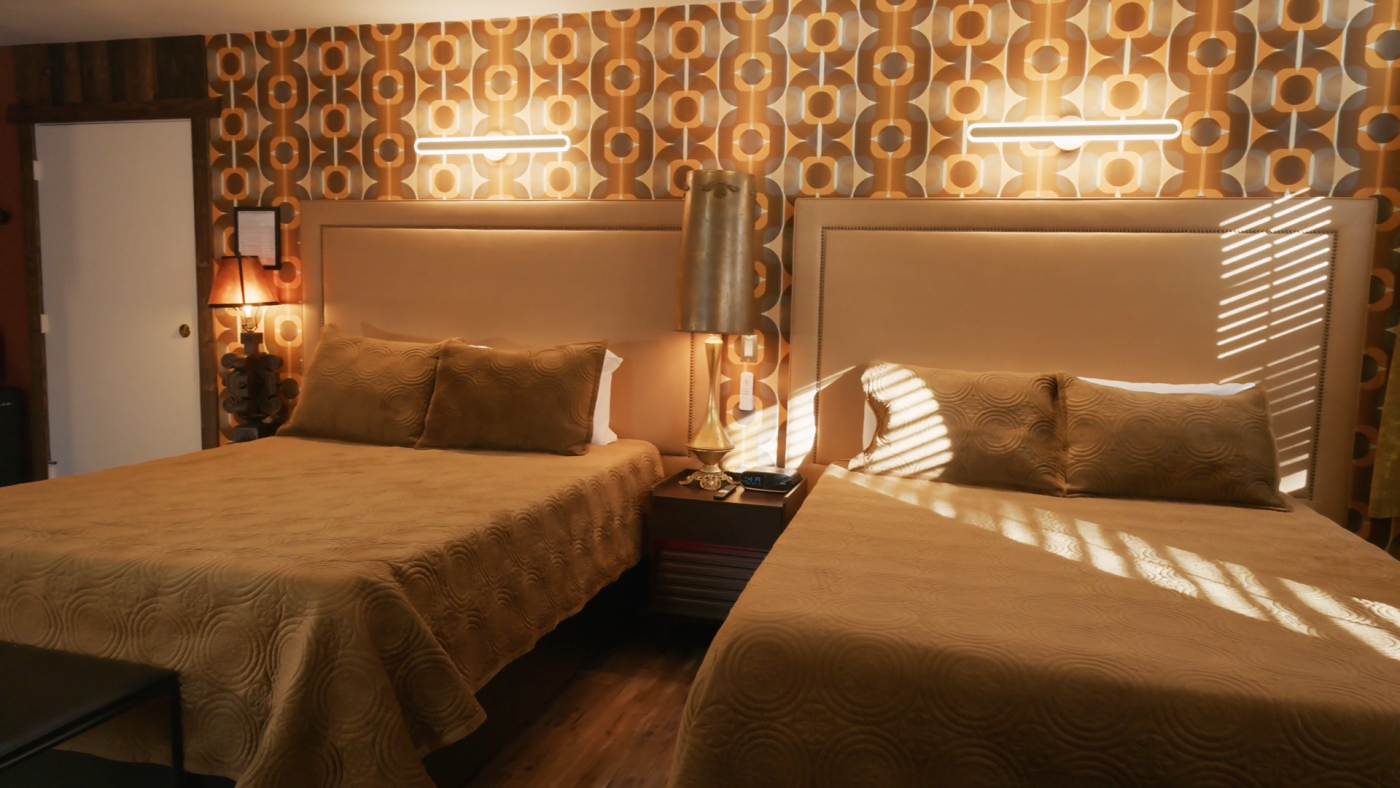 Inspirado en el espíritu despreocupado de los campamentos de verano de los años 70, el recinto invita a relajarse junto a las crepitantes hogueras o en el salón junto a la piscina, mientras que en el interior, la calidez de mediados de siglo —madera oscura, detalles en latón y texturas de pana— te envuelve en nostalgia.