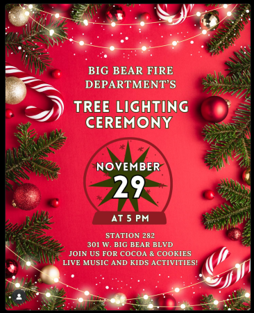 ¡Esta es la temporada para una celebración festiva de luces! Únase a nosotros en el Departamento de Bomberos de Big Bear para una festiva ceremonia de iluminación del árbol que no querrá perderse.