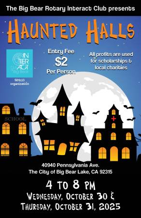 Este es un evento de la firma para el Big Bear Lake Interact Club para 2 noches 30 de octubre y 31, 4:00 PM a 8:00 PM. Concebido durante COVID como el Drive Thru Haunted House, el club ha continuado con la tradición como uno de sus recaudadores de fondos. Todo lo recaudado se destina a organizaciones benéficas locales y a becas para estudiantes de secundaria.