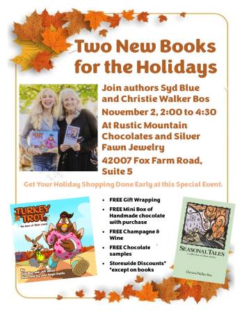 Dos autoras locales firmarán sus nuevos lanzamientos para regalar durante las fiestas. Syd Blue, con su nuevo libro infantil "Turkey Trot", y Christie Walker Bos, con su colección de cuentos "Seasonal Tales", estarán presentes en Rustic Mountain Chocolates y The Silver Fawn Jewelry. Envoltorio de regalo gratis, mini caja de chocolate gratis con su compra, vino y champán gratis, y descuentos en toda la tienda en otras mercancías.