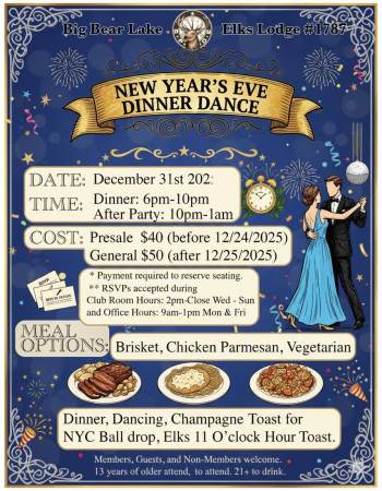 Acompáñenos en Elks Lodge este 31 de diciembre para disfrutar de una emocionante cena y baile de Nochevieja con un suculento plato de pechuga de ternera, pollo a la parmesana y delicias vegetarianas. Continuaremos la celebración con la caída de la bola de Nueva York, un brindis por el nuevo año y una fiesta posterior que no querrá perderse.