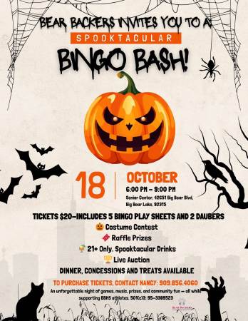 Celebre Halloween en Big Bear con una animada noche de bingo, premios y diversión. Disfrute de un bar completo (21+), cena y concesiones, rifas, una subasta en vivo, y un concurso de disfraces festivos.